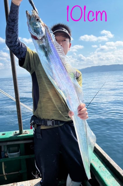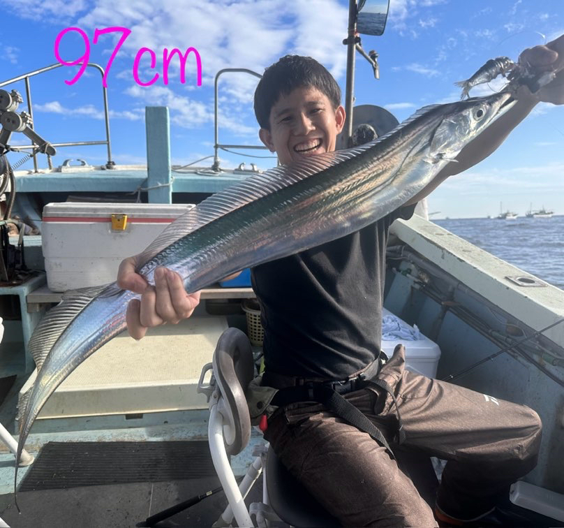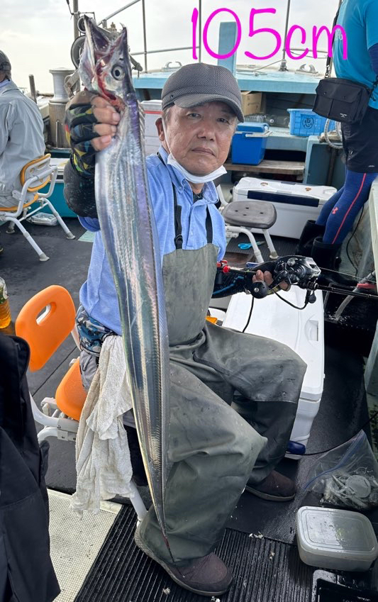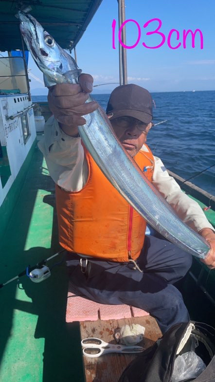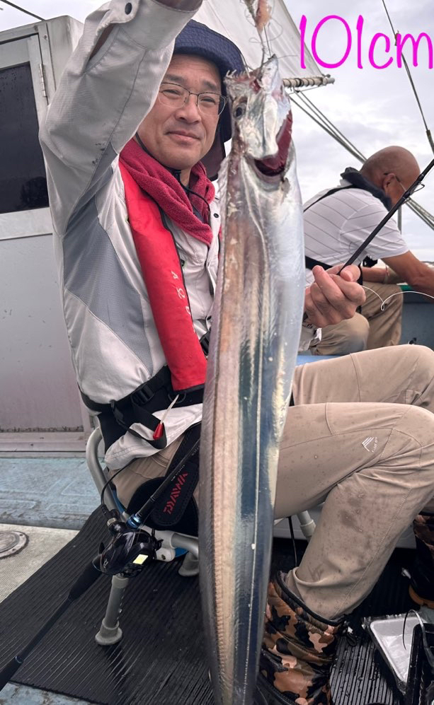 まだ少し波が残っていましたが、今日は良いサイズもまじり、アタリも帰りまで続いて文句なしでした🎉 メーター級もきましたよ〜。皆さんクーラー重たかったです!深場のポイントなので、テンヤのみで釣ってもらいました。 名川さん タチウオ 95センチまで 88匹😱 本村さん タチウオ 108センチまで80匹😳
