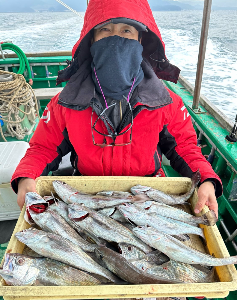 雨はなく助かりました!今日も潮も良くて釣りやすく、特に前半はよくあたってました! サイズもまずまずで35センチ前後が多かったです😆 栂さん クログチ 40センチまで 16匹‼️ 船越さん 42センチまで 14匹‼️