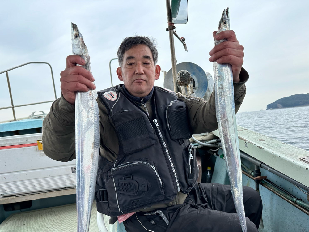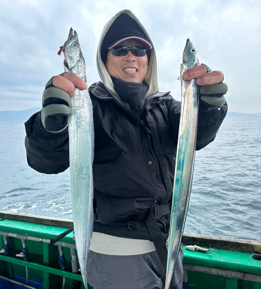 今日はタチウオ狙いです。 前半はアタリは出ていました。やはり小さなアタリが多かったですね。 終盤はポツポツとアタルくらいでした。 神谷さん タチウオ 85センチまで 12匹‼️ 符川さん 90センチまで 10匹‼️