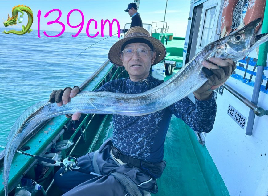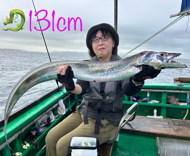 ドラゴン🐉きました〜🎉🎉🎉 朝イチの1匹目いきなりでした! おはようドラゴン‼️ 全体的には小さなアタリが多く、なかなか掛けるのが難しかったです。アタリは出ていました👍 筧さんお二人で タチウオ 131cmまで 39匹‼️ 21匹と18匹でした👏 ドラゴンおめでとうございます🎉