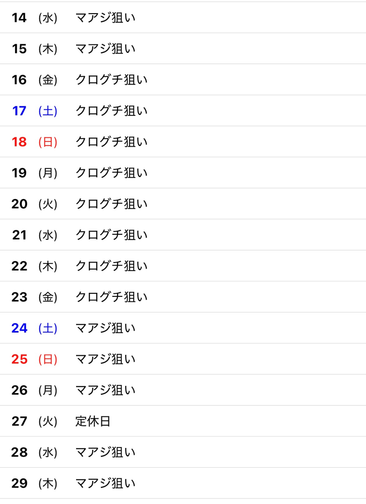 釣果情報 · 2025/05/12 5月12日(月) 今日は人数揃わずお休みでした🥲 明日(火)は定休日です。 14日(水)は出船予定です。 ご予約お待ちしております! 出船5時30分〜納竿11時30分 となります。 4時50分までには必ずお越し下さい。 よろしくお願い致します🙇 tagPlaceholderカテゴリ: 2025年 5月