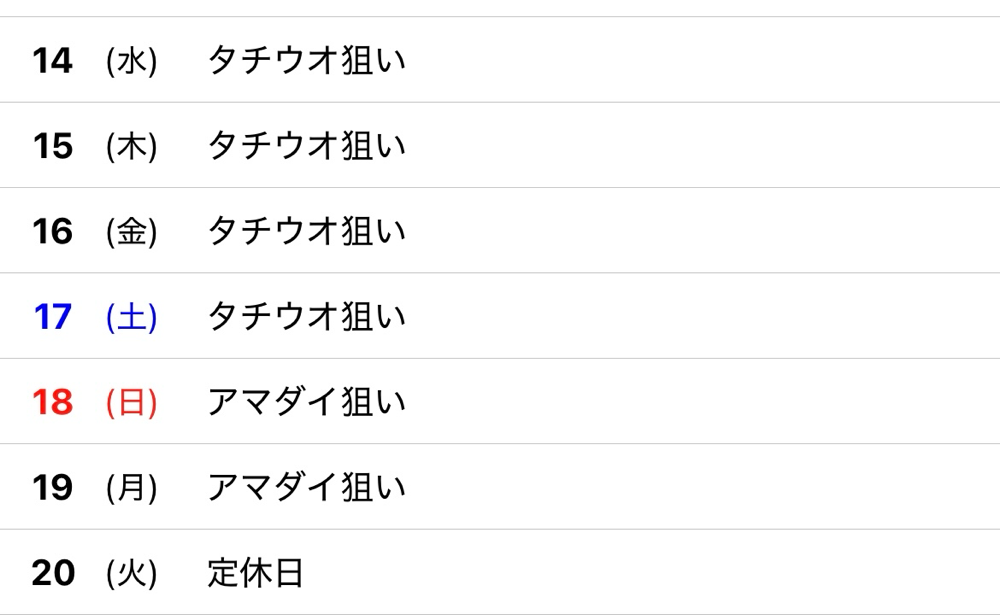 釣果情報 · 2026/01/13 1月13日(火) 出船していない日が続いております🥲 タチウオ狙い、甘鯛狙いもゆったり空いてますので、ご予約お待ちしております😊 tagPlaceholderカテゴリ: 2026年 1月
